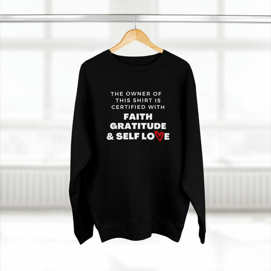 CERTIFIED IN FAITH, GRATITUDE & SELF LOVE PREMIUM CREWNECK SWEATSHIRT