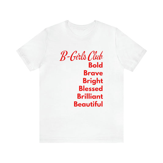 B GIRLS CLUB: BOLD, BRAVE, BRIGHT, BLESSED, BRILLIANT, AND BEAUTIFUL SHORT SLEEVE TEE