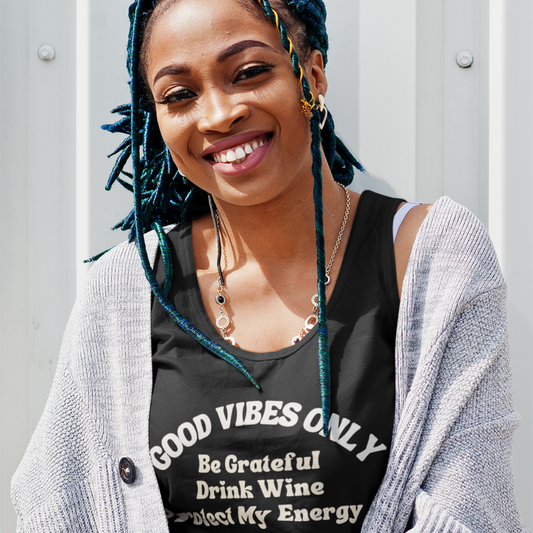 GOOD VIBES ONLY: BE GRATEFUL DRINK WINE PROTECT MY ENERGY WOMEN'S RACERBACK TANK